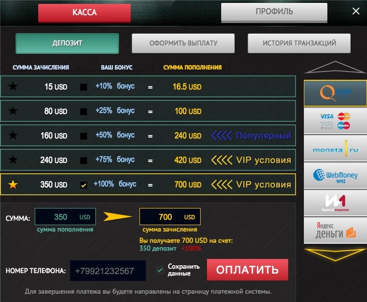 - Сделайте первый депозит, от размера депозита зависит размер бонуса.
