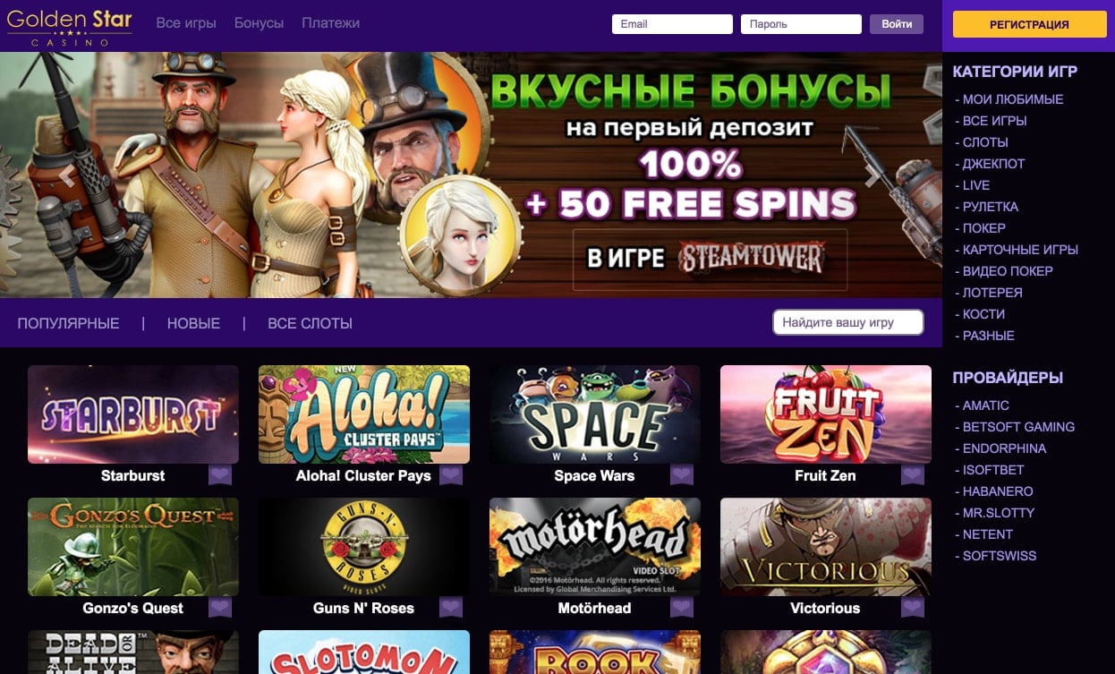 Golden Star Casino предлагает более 500 игр различных форматов, в том числе видео-покер и обычный покер, рулетку, лотерею, блэкджек, кости и многие другие. Желающие смогут сыграть с живым крупье в разделе Live-казино.