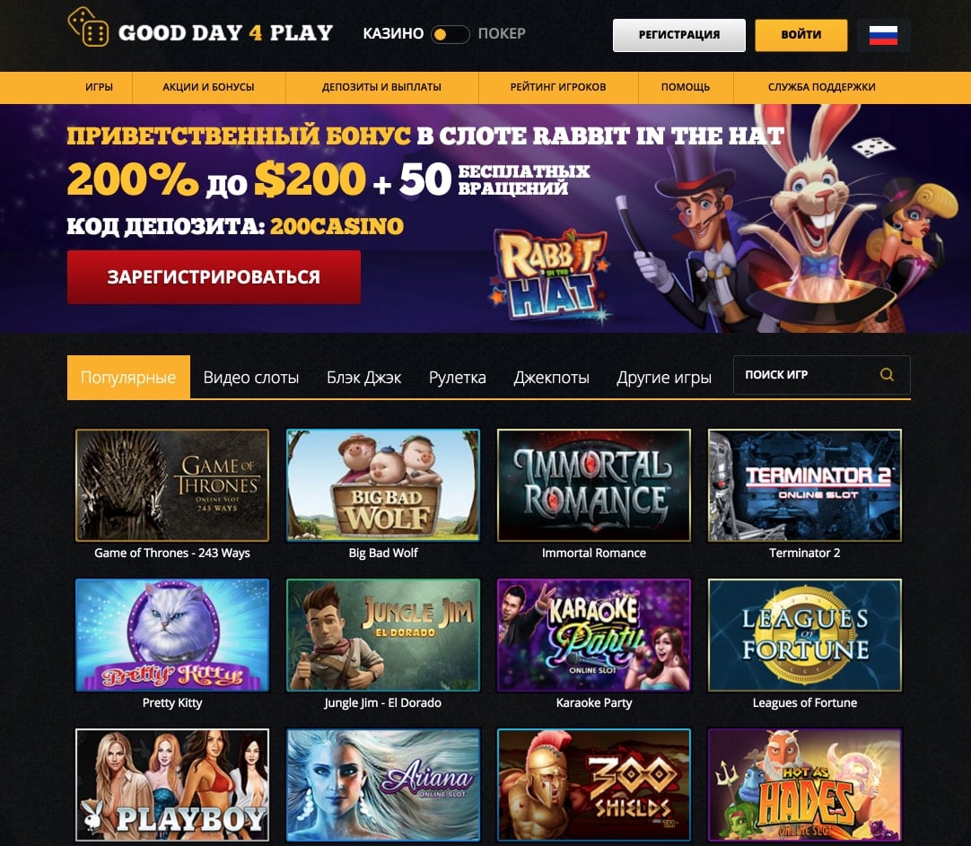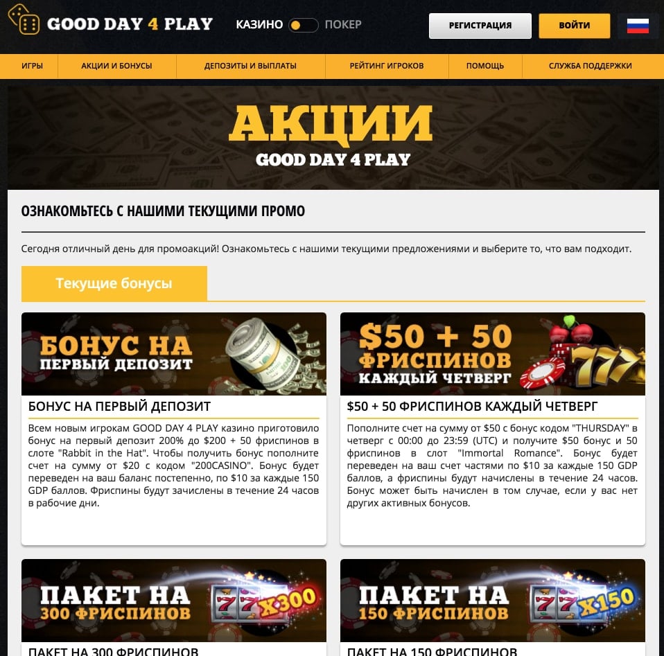 Казино Good Day 4 Play пользуется хорошей репутацией у любителей азартных игр в интернете. Отличная бонусная политика, удобный интерфейс, хорошая служба поддержки и неплохое разнообразие игр – это солидный набор преимуществ, который легко привлекает как новичков в мире гемблинга, так и заядлых игроков.