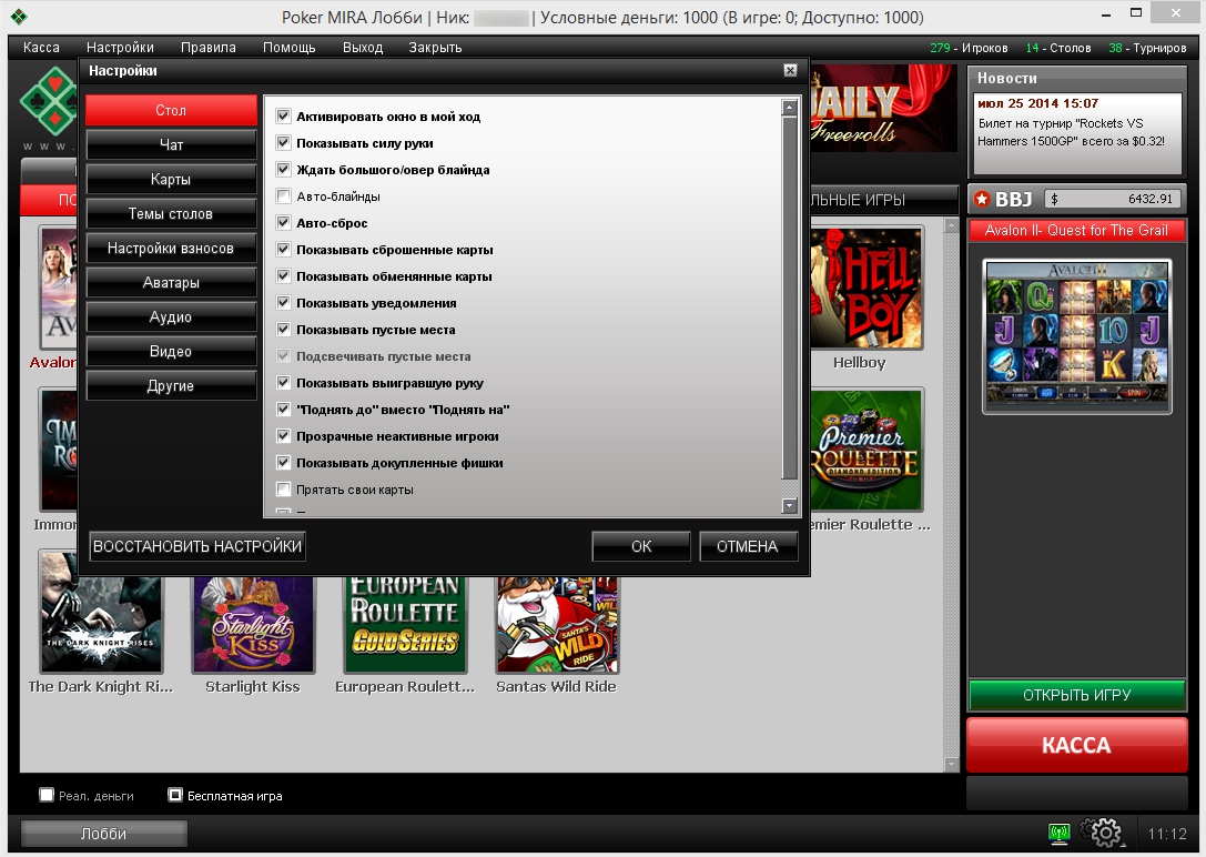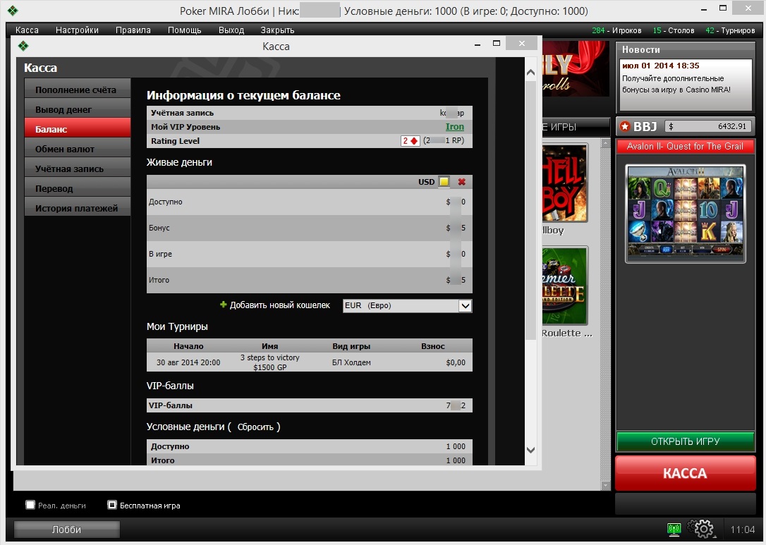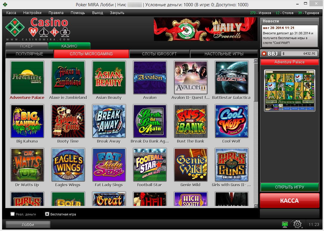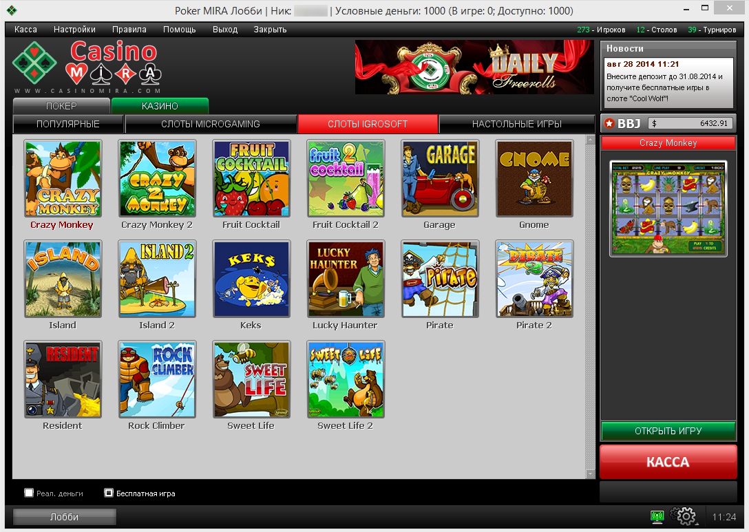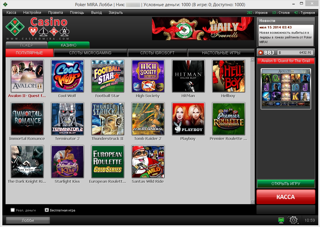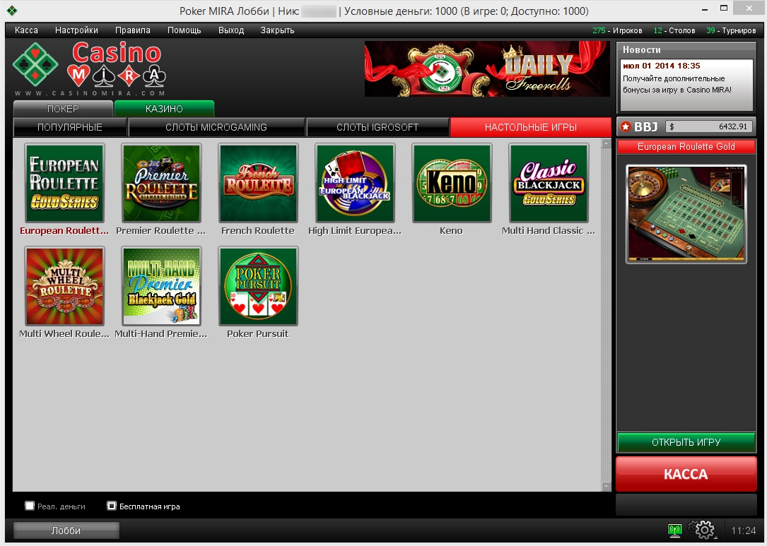 Загружаемый клиент для компьютеров с Windows и flash-клиент для любого современного браузера и операционной системы. Любители покера уже знакомые с PokerMIRA по достоинству оценят общее лобби в котором одним кликом переключается "Покер" и "Казино".