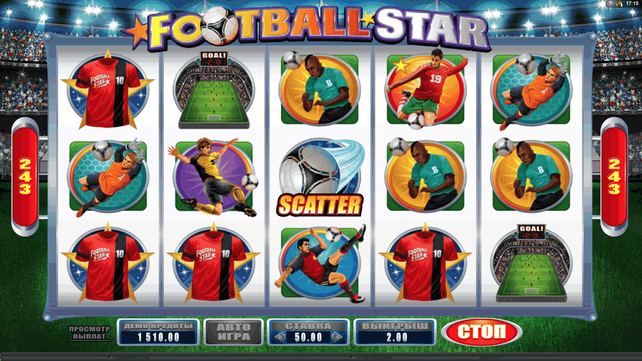 Football Star – это игровой автомат с потрясающим акустическим погружением в мир футбола, вы будете чувствовать себя на трибунах огромного стадиона. 5 барабанов, 3 ряда и 243 выигрышных комбинации. Имеет в своем арсенале скаттер и вайлд символы – бонусные игры и множители.
