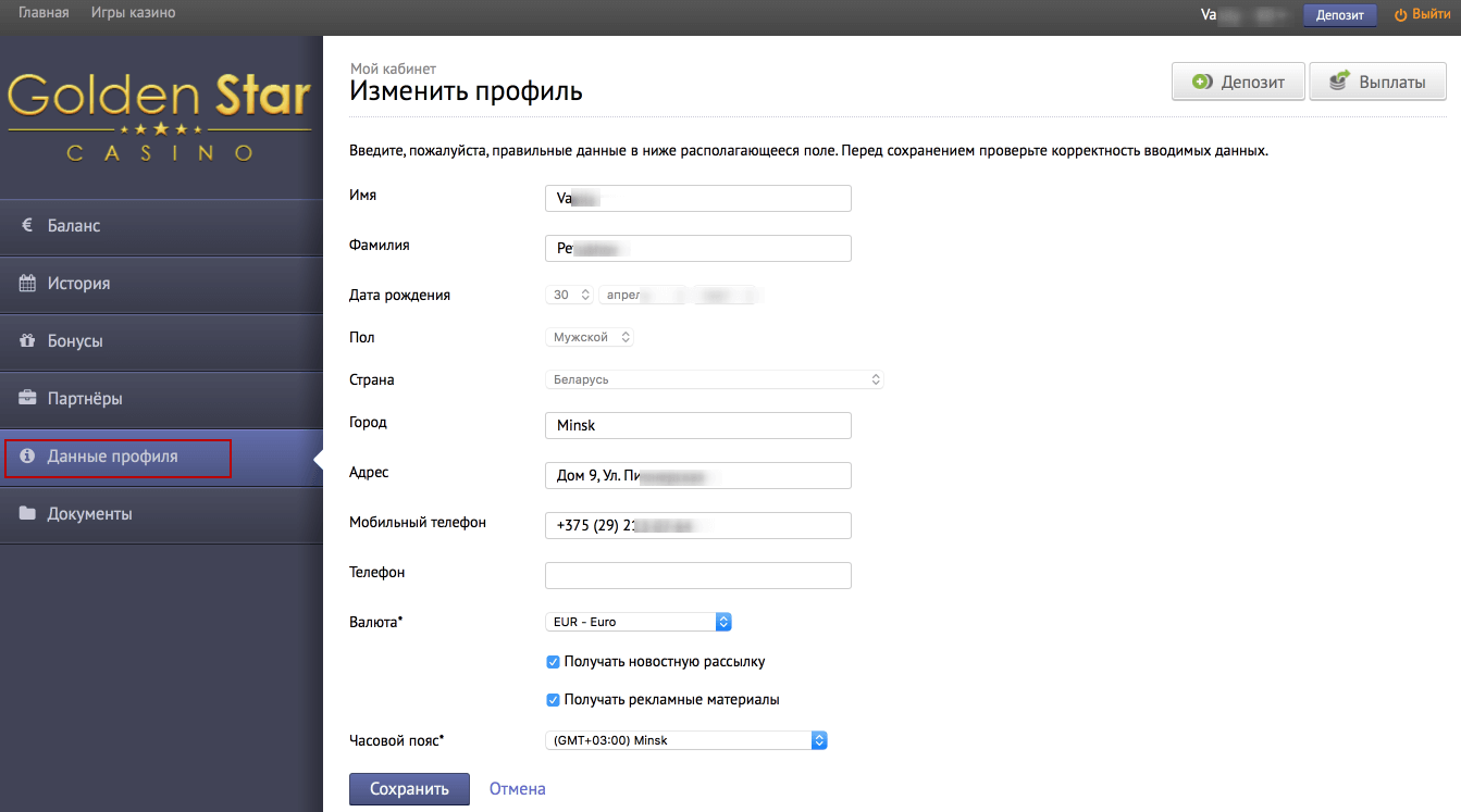 - Заполните Профиль в казино (имя, адрес, телефон)