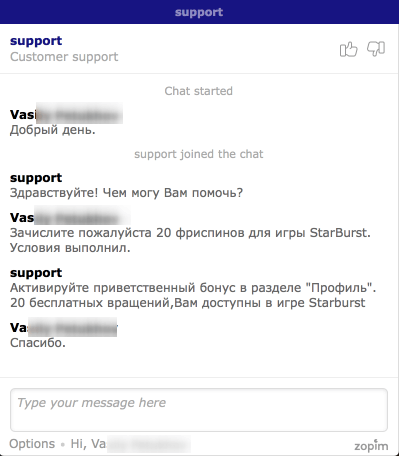 - Напишите в онлайн чат и попросите активировать 20 фриспинов для игры Star Burst.
