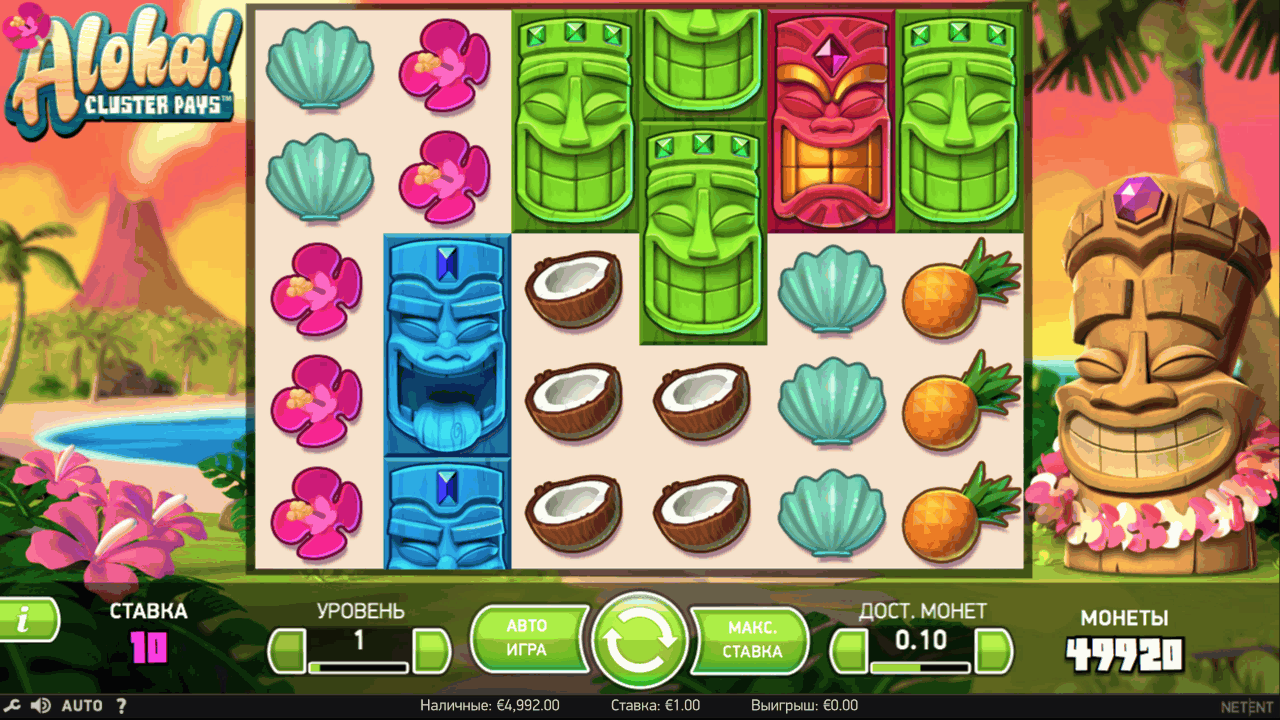 Aloha – это анимированный гавайский мир, скажи выигрышам "Привет!". Представляет из себя кластерный автомат с шестью барабанами, в котором нет игровых линий, выигрыш происходит при выпадении одинаковых символов в соседних ячейках. Разработан Net.Ent.