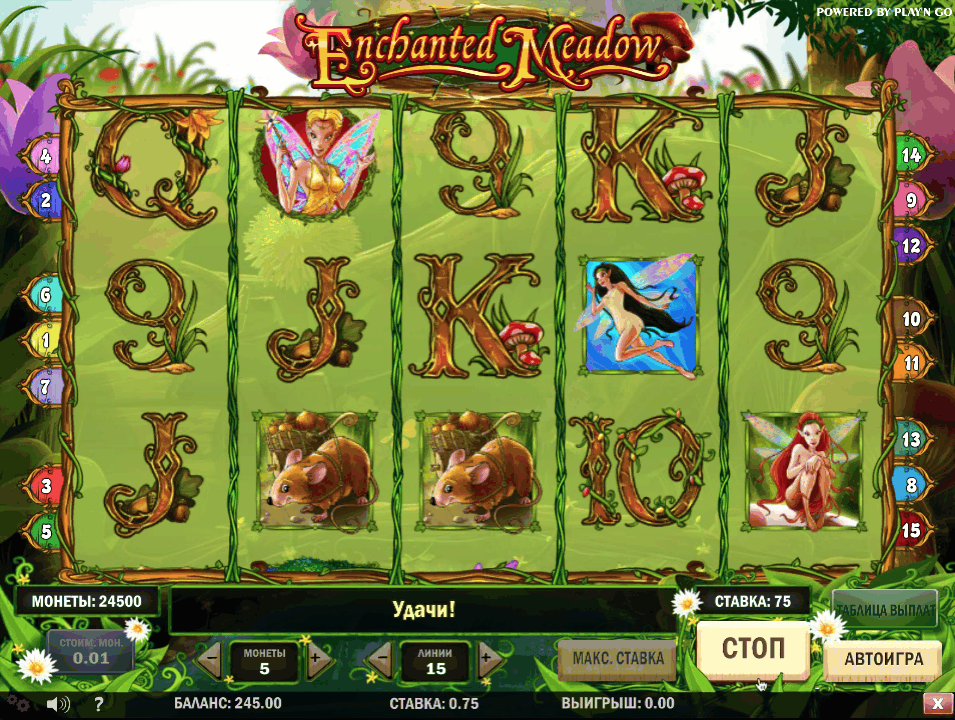 Enchanted Meadow – это волшебный сказочный мир с великолепной графикой и чарующими звуками. Имеет 5 вращающихся барабанов, 3 горизонтальных ряда и 15 игровых линий. Доступен дополнительный игровой раунд, в котором можно удвоить выигрыши, нужно просто угадать цвет карты, а если угадаете масть, то приз будет умножен в 4 раза. Создана компанией Play'n Go.