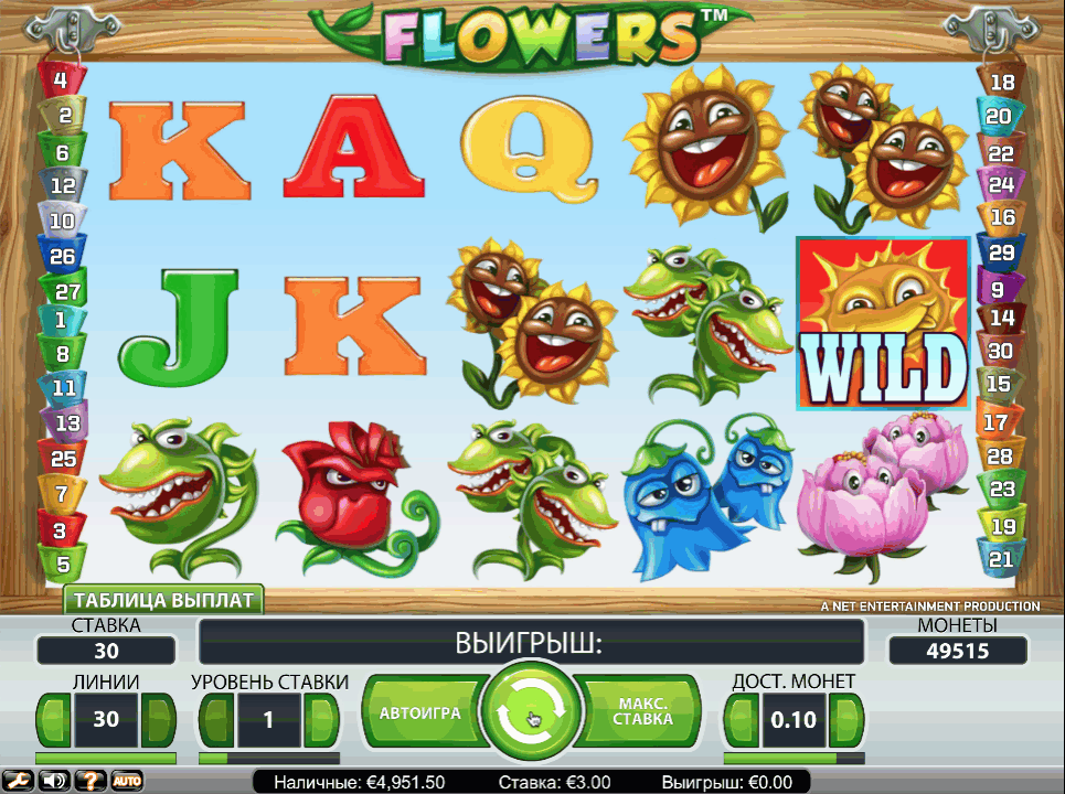 Flowers – красочный мир цветов и растений, разработанный компанией Net.Ent. Игра имеет 5 барабанов, 3 ряда и до 30 линий.