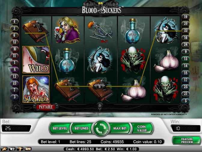 Игра Blood Suckers разработана студией NetEnt, что уже о многом говорит. Halloween чувствуется во всем, мрачная музыкальная озвучка и жутковатые анимированные картинки придутся по вкусу поклонникам вампиров и другой нечисти. А вот щедрые выигрыши понравятся всем игрокам без исключения, даже истинным любителям самого светлого и доброго ;)