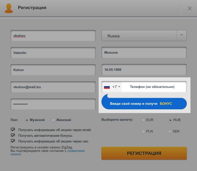 ЗигЗаг бездеп 50₽ при подтверждении телефона.
