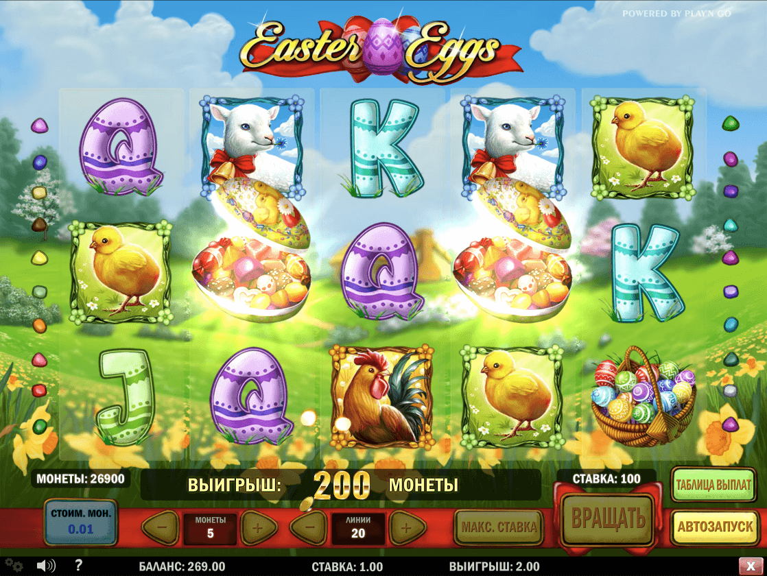 Free Spins распространяются только на игровой автомат «Easter Eggs» – это 5 барабанов и 20 игровых линий, есть Wild, Scatter и Bonus символы. Игра оформлена в пасхальном стиле, с милыми зверушками, доброй графикой и спокойной музыкой.